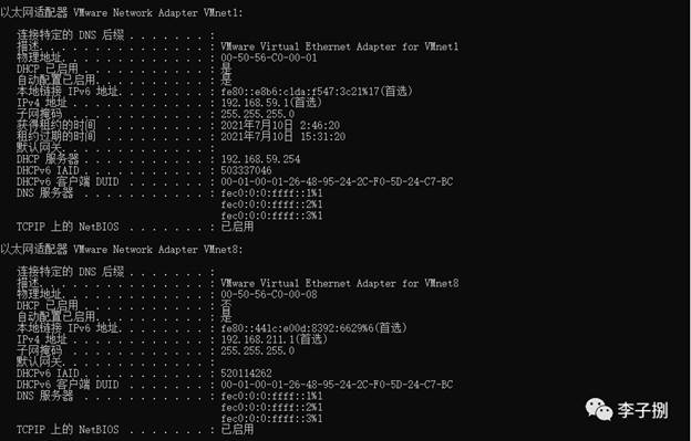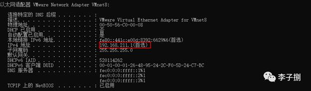 通过ipconfig -all查询到VMnet8网卡的网段为192.168.211